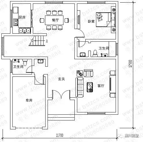 一 層:客廳、臥室(附衛生間)、廚房、餐廳、衛生間、車庫