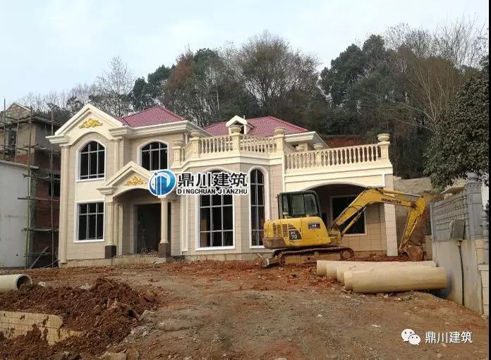 建房實拍圖和效果圖高度一致。淺色的外墻色調精致典雅,金色的山花,紅色的外墻讓房子整體效果更加生動活潑。