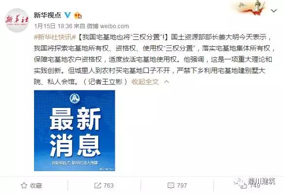 2018年1月15日,國土資源部部長表示,我國農村宅基地也將實行“三權分置”!宅基地實行三權分置的總體發展方向為:允許農村宅基地進入市場,參與市場競價。