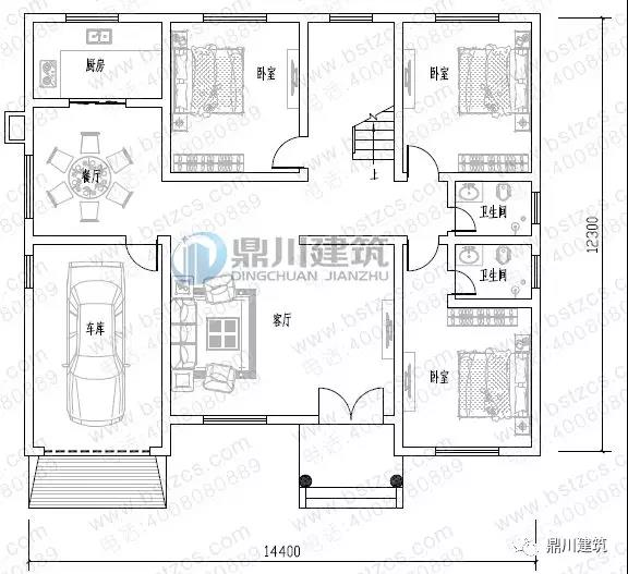 一 層: 客廳、臥室(附衛(wèi)生間)、2臥室、廚房、餐廳、衛(wèi)生間、車庫(kù)