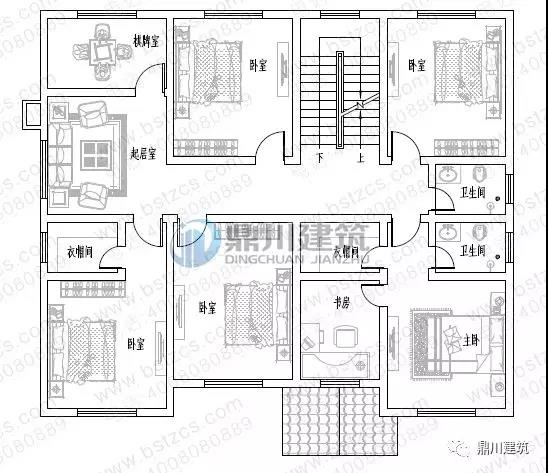 二 層: 起居室、臥室(附衣帽間,衛(wèi)生間)、臥室(附書房,衣帽間)、臥室、書房、衛(wèi)生間