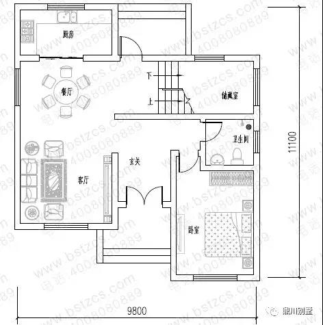 一 層: 玄關(guān)、客廳、臥室、廚房、餐廳、儲藏室、衛(wèi)生間