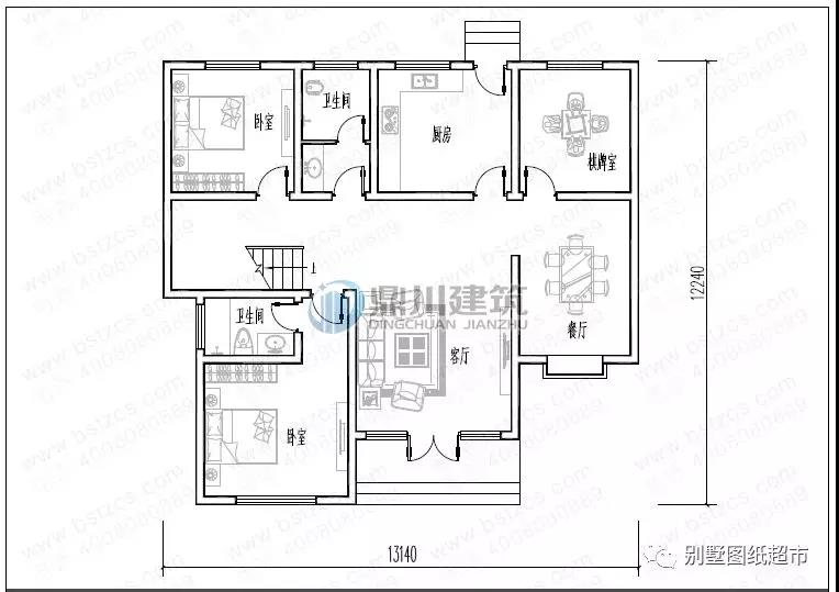一 層:客廳、臥室(附衛生間)、臥室、棋牌室、廚房、餐廳、衛生間