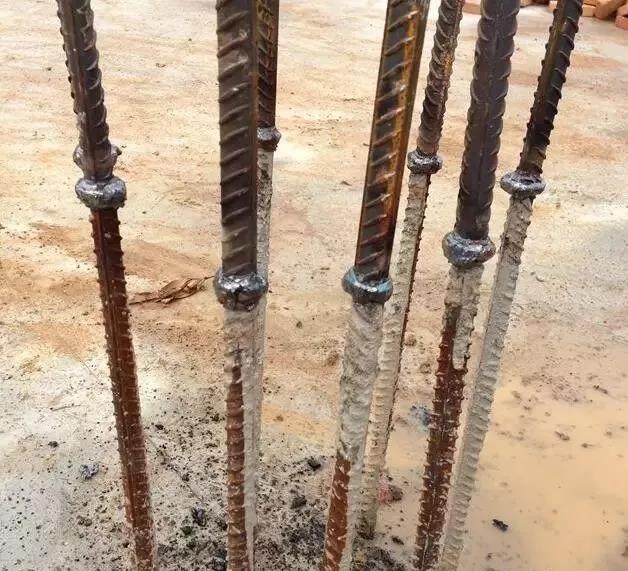 這種熱熔式的鋼筋接頭方式是業主專門找來的焊接工人用他們的三相焊接設備做的。它比傳統的搭接焊更牢固,理論上講,如果焊接合格,接頭的強度甚至優于鋼筋本身的強度!