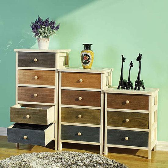 此款斗柜的柜體為白色,每一格抽屜的面板則涂刷了不同的色彩,色塊的拼接顯示出十分現代、時尚的設計理念。
