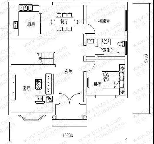 一 層: 玄關、客廳、臥室、棋牌室、廚房、餐廳、衛生間