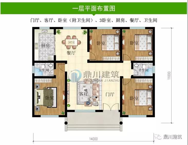 14×11米一層別墅,4個臥室2個衛生間,這樣的戶型很完美!