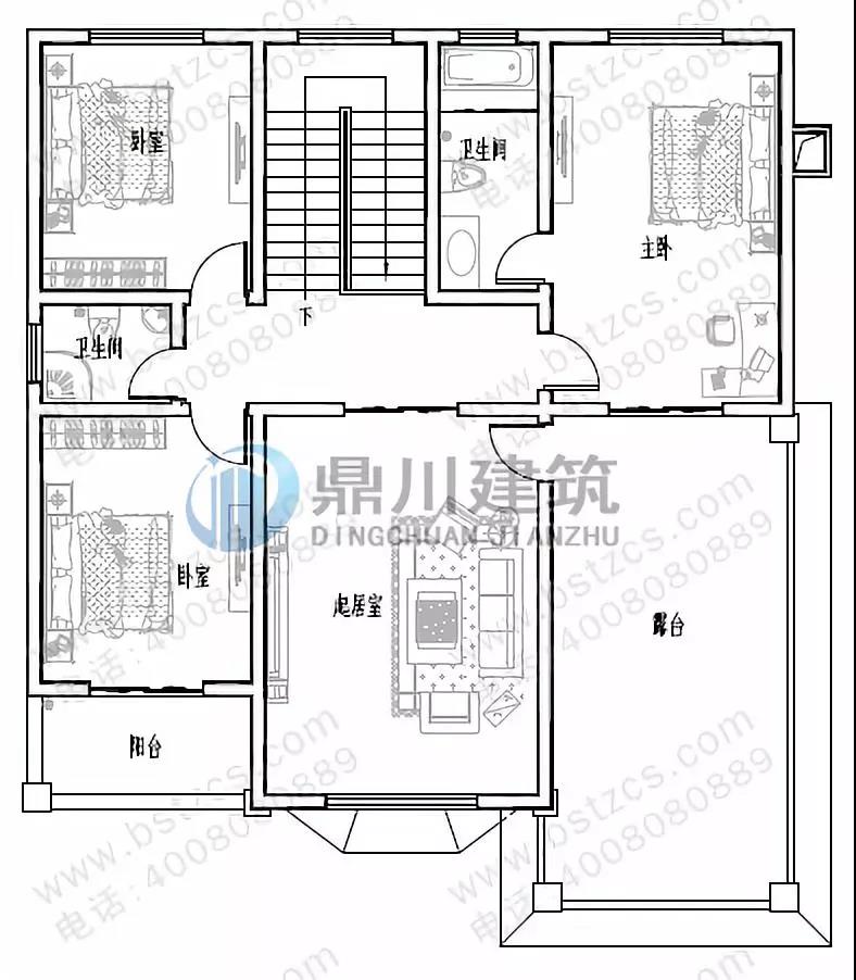 二 層:客廳(附陽臺)、主臥(附衛(wèi)生間)、3臥室、衛(wèi)生間