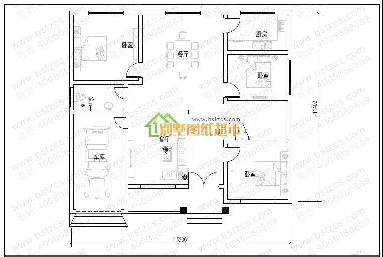 一 層:客廳、3臥室、廚房、餐廳、衛生間、車庫
