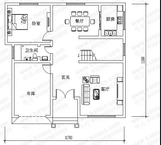 一 層: 入口玄關(guān)、客廳、餐廳、廚房、客房、衛(wèi)生間、車庫