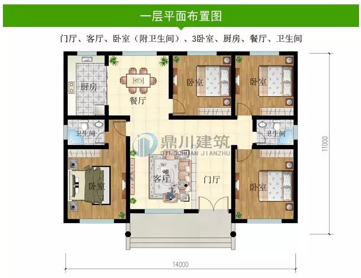 一 層:門(mén)廳、客廳、2臥室、廚房、餐廳、衛(wèi)生間