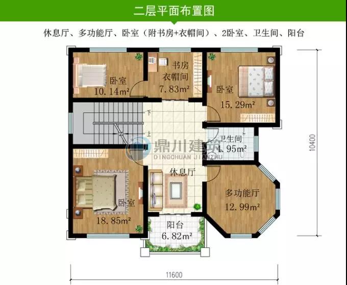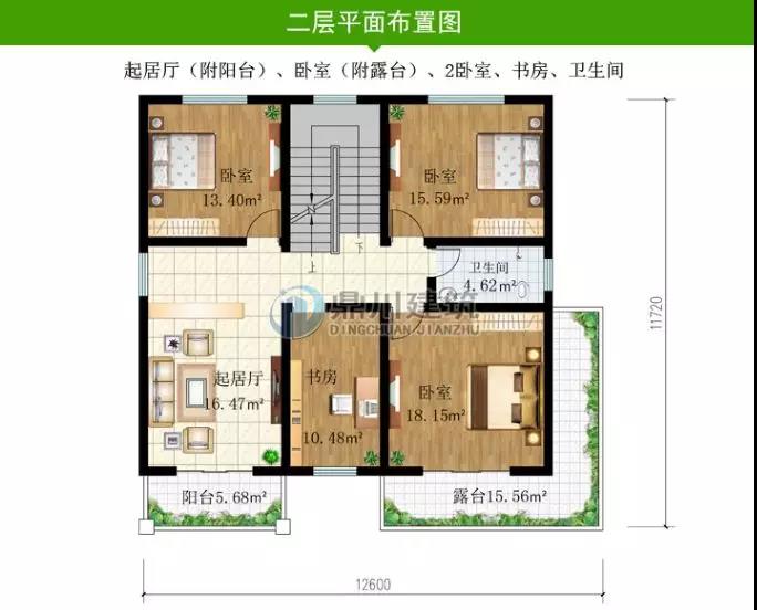 二層設有三間臥室,一個起居室,一個書房,為主要休息和工作的區域,此款戶型實用型高,很適合農村建!