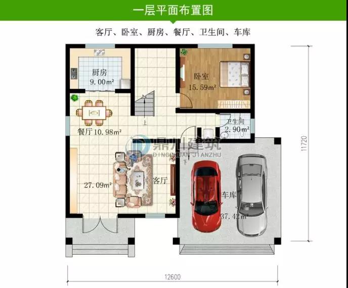 一 層: 客廳、臥室、廚房、餐廳、衛生間、車庫