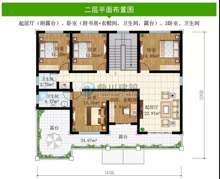 二層:起居廳(附露臺(tái))、臥室(附書房+衣帽間,衛(wèi)生間,露臺(tái))、3臥室、衛(wèi)生間。