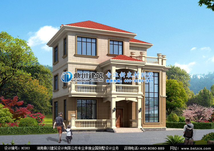 HC083復式三層農村別墅圖紙外觀效果圖,鼎川建筑三層農村住宅別墅外觀效果圖