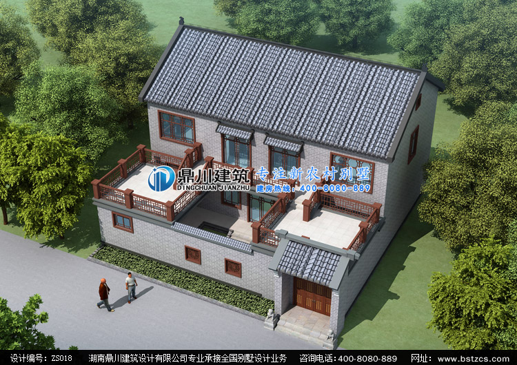 ZS018二層帶內院農村自建房設計圖效果圖,農村中式自建房屋住宅設計外觀效果圖