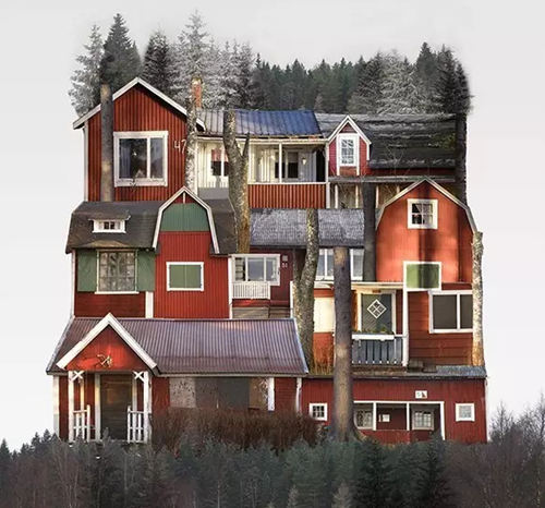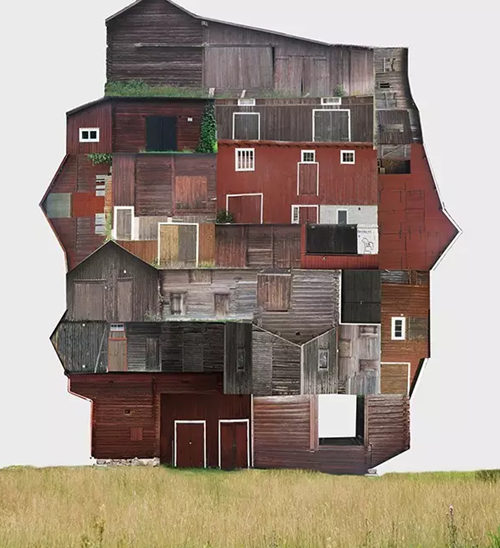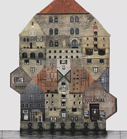 該系列拼接畫名為“genius loci(地方風氣)”,描繪了由許多小房屋構(gòu)成的大房子,這些房屋都是某個地方或國家特有的風格。它們連接著這些地方的土地,承載著這些地方的精神,不僅體現(xiàn)了虛擬的建筑現(xiàn)實(由各種門窗隨意、古怪地堆積在一起),而且體現(xiàn)了當?shù)氐奈幕蜕罘绞健?/p>