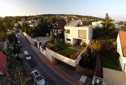 房子是巧妙地安裝在山坡上,充分利用空間的可能性。由于設置不臨街的房子前,空間是一個小花園,俯瞰城市創建。街上的第一層為車庫之間的高度差,綠化覆蓋。