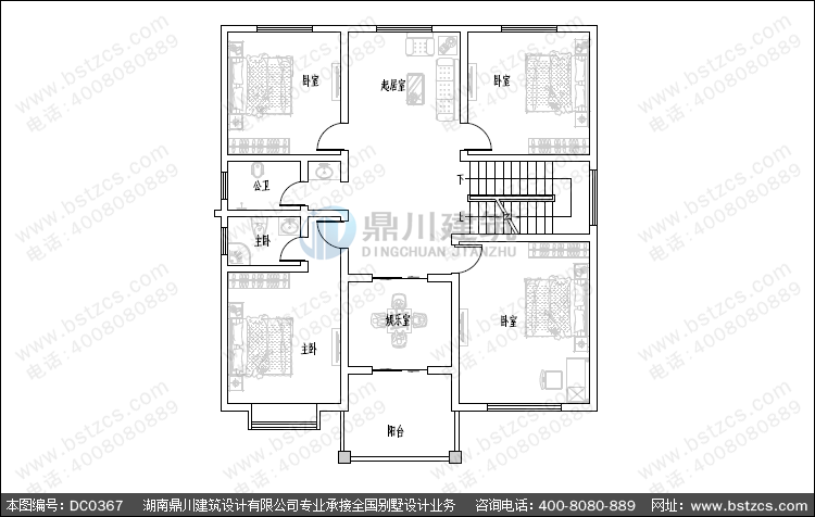 二 層:起居室、娛樂室(附陽臺)、臥室(附衛(wèi)生間)、3臥室、衛(wèi)生間