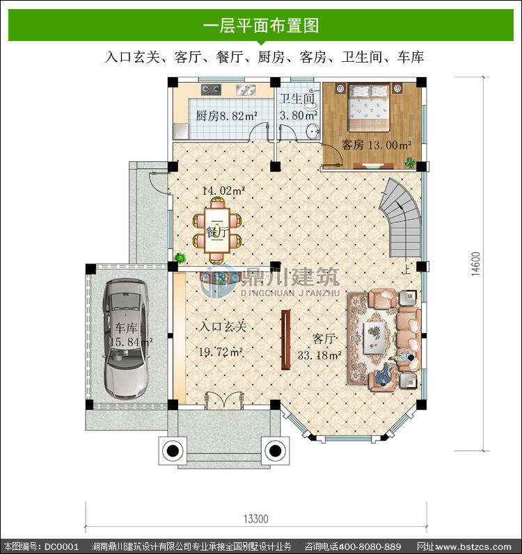 | 一 層: | 入口玄關、客廳、餐廳、廚房、客房、衛生間、車庫 | |||