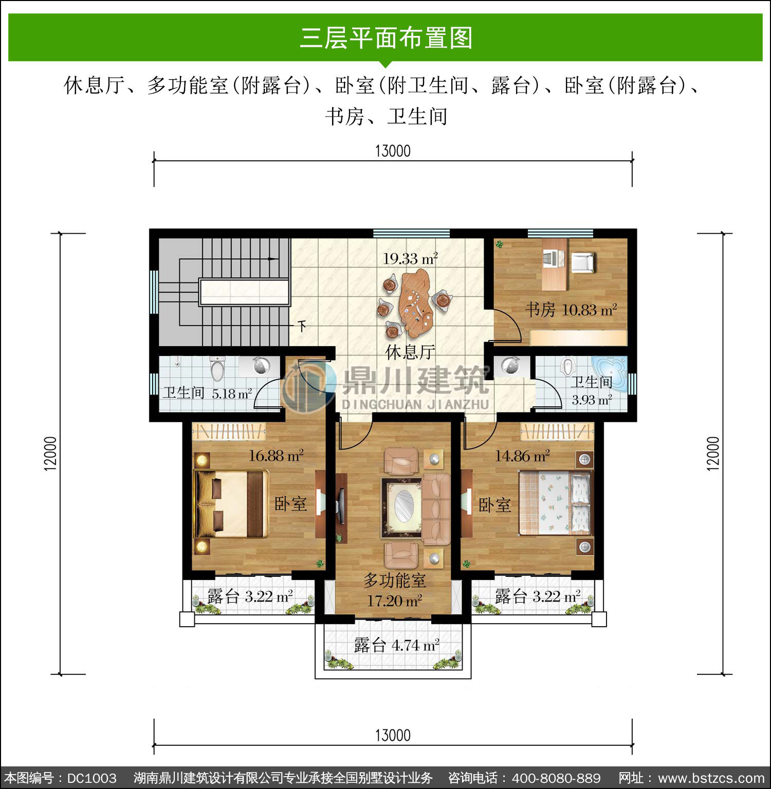 | 三 層: | 休息廳、多功能室(附露臺)、臥室(附衛(wèi)生間、露臺)、臥室(附露臺)、書房、衛(wèi)生間 | |||