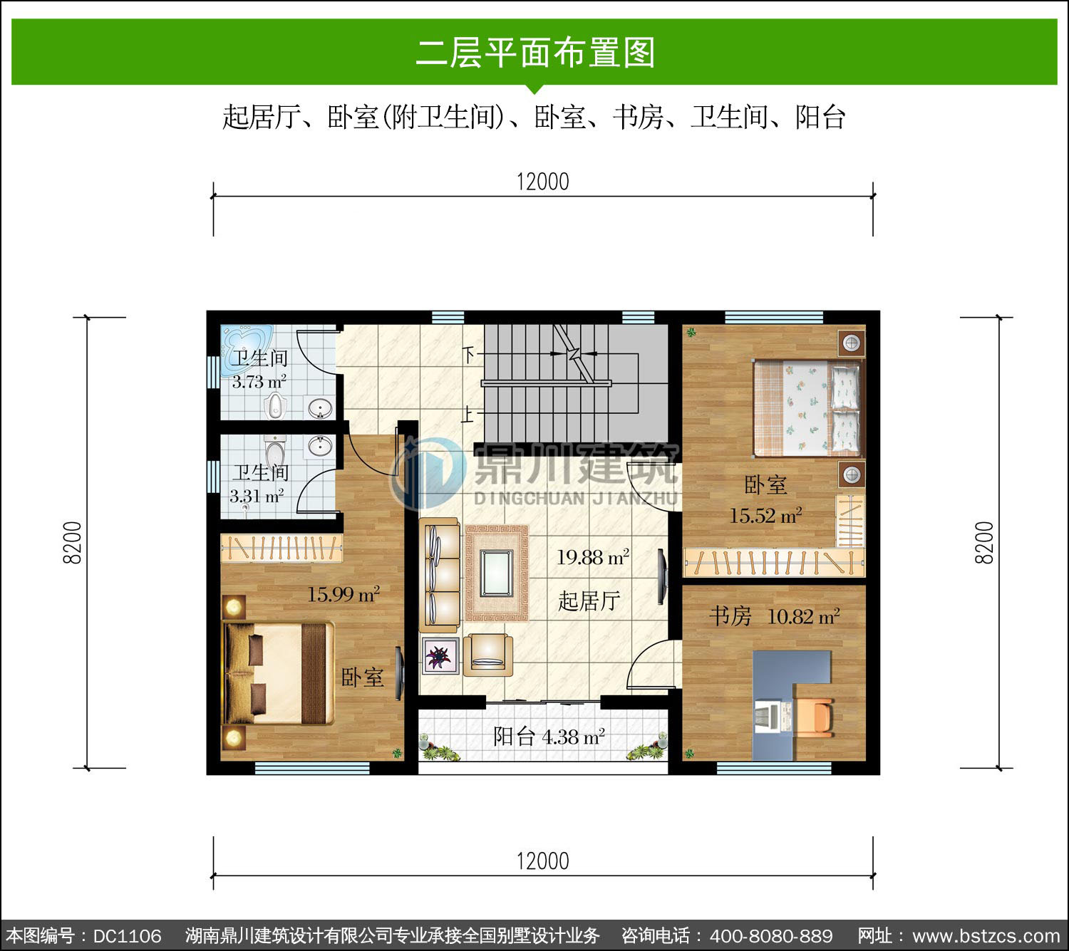 | 二 層: | 起居廳、臥室(附衛生間)、臥室、書房、衛生間、陽臺 | |||