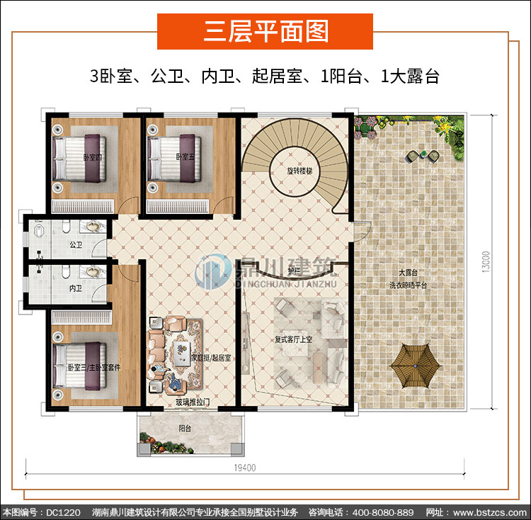 | 三 層: | 4臥室、起居室、公衛、內衛、露臺 | |||