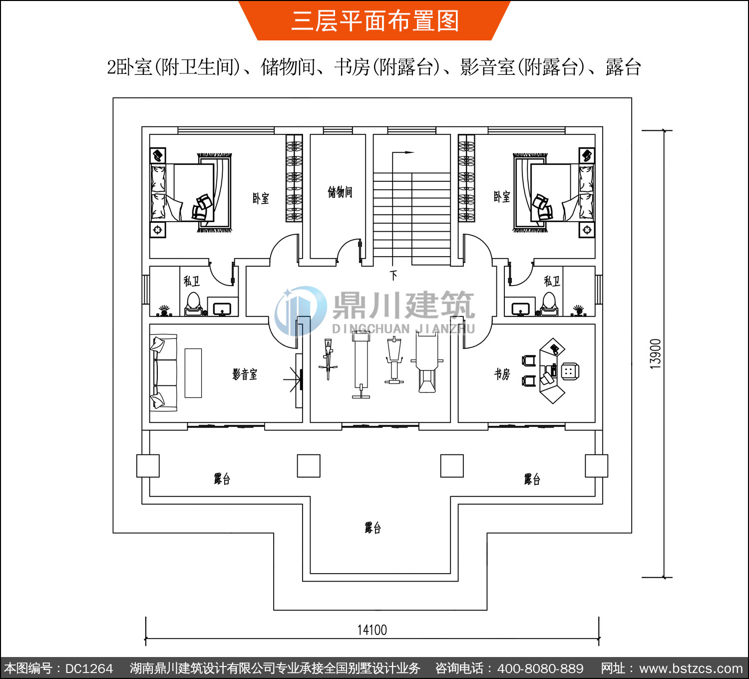 | 三 層: | 2臥室(附衛生間)、儲物間、書房(附露臺)、影音室(附露臺)、露臺 | |||