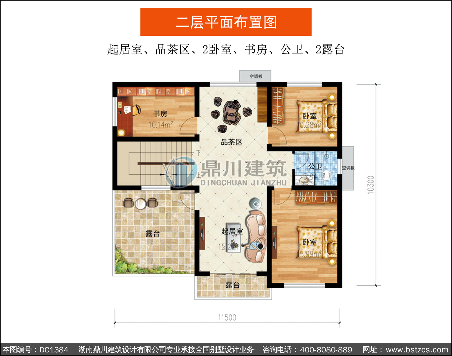 二 層: 起居室、品茶區(qū)、2臥室、書房、公衛(wèi)、2露臺