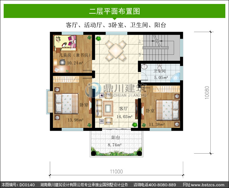 二 層: 客廳、活動廳、3臥室、衛(wèi)生間、陽臺