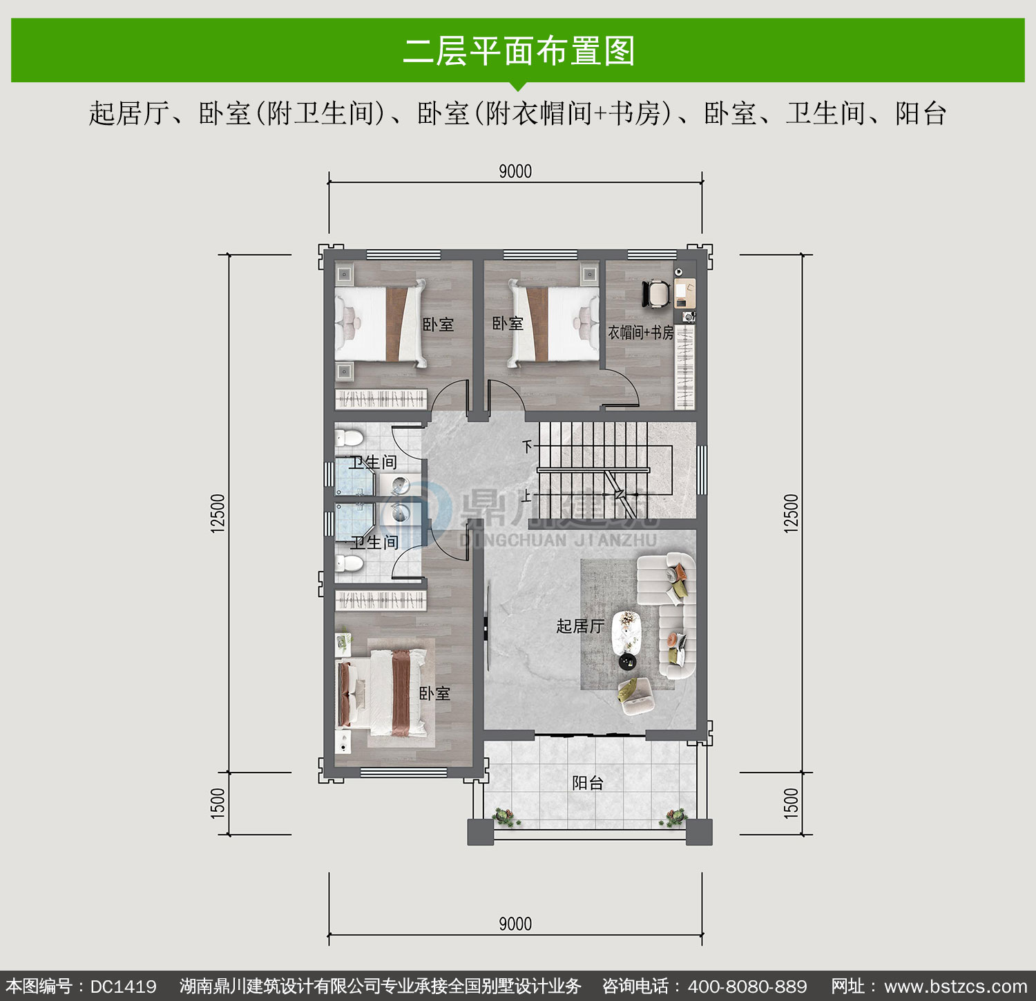 | 二 層: | 起居廳、臥室(附衛(wèi)生間)、臥室(附衣帽間+書房)、臥室、衛(wèi)生間、陽臺 | |||