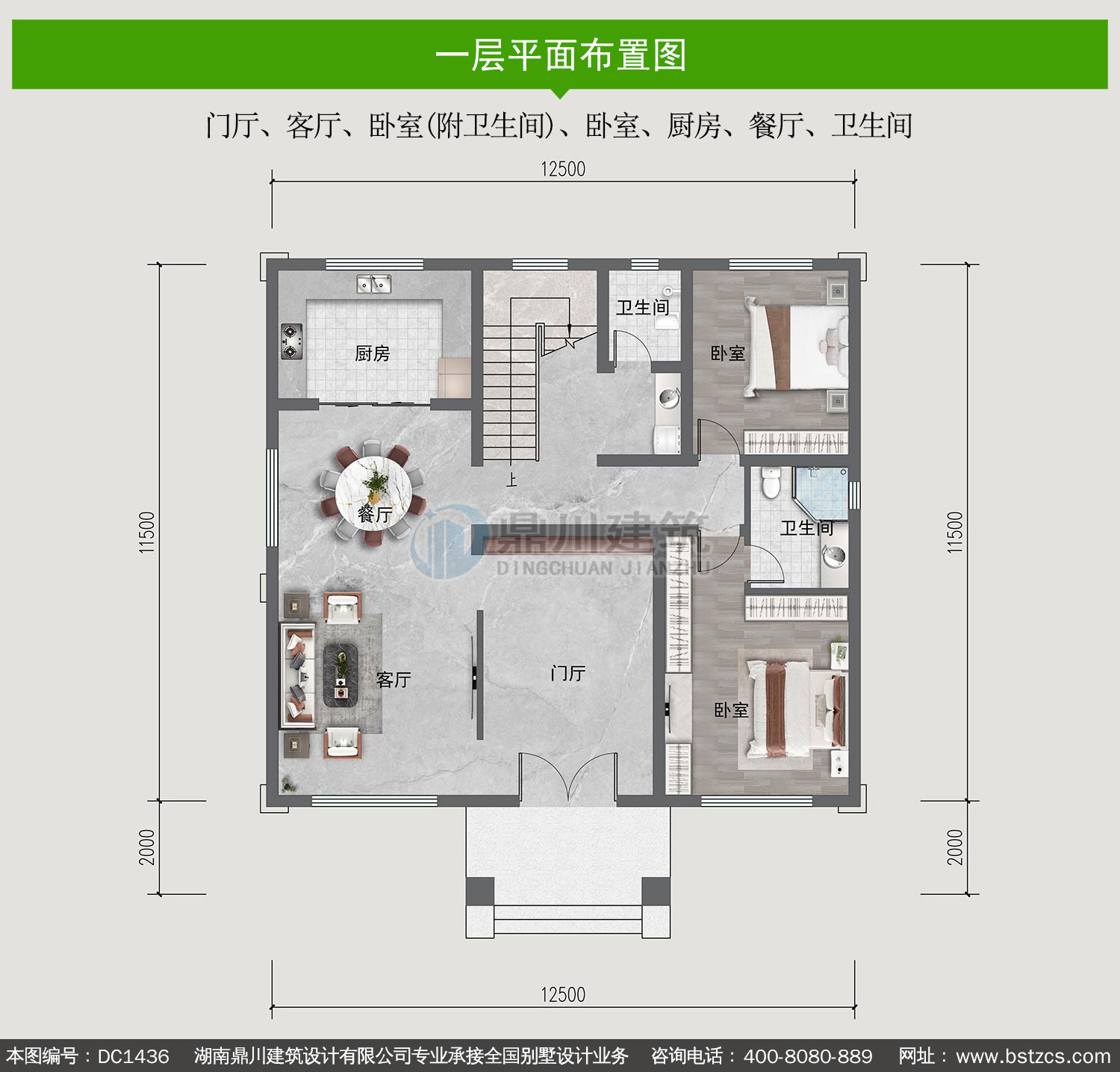 一 層: 門廳、客廳、臥室(附衛生間)、臥室、廚房、餐廳、衛生間