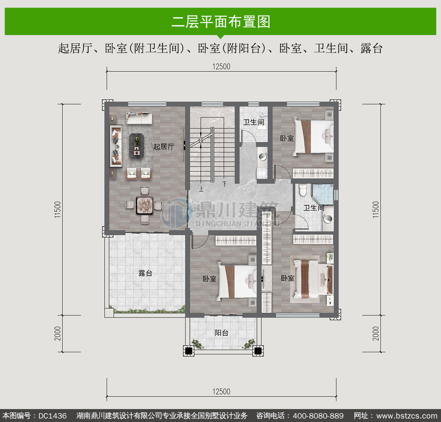 二 層: 起居廳、臥室(附衛生間)、臥室(附陽臺)、臥室、衛生間、露臺