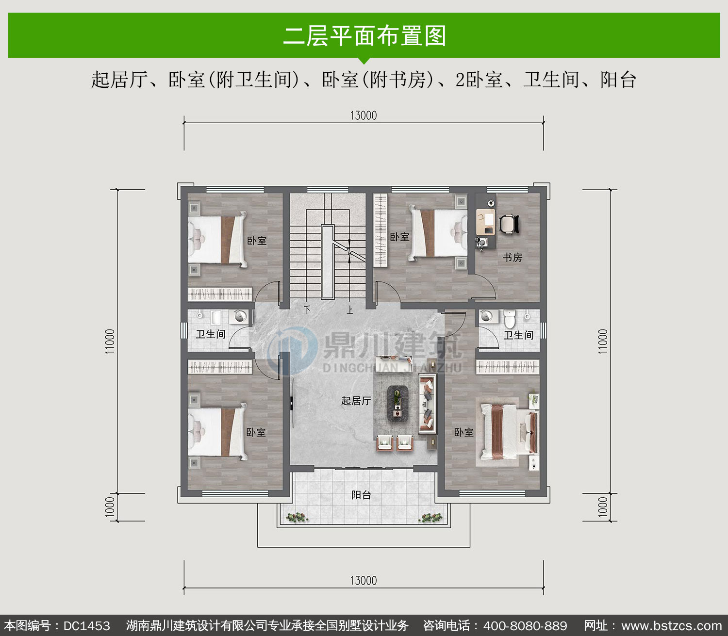 | 二 層: | 起居廳、臥室(附衛(wèi)生間)、臥室(附書房)、2臥室、衛(wèi)生間、陽臺(tái) | |||