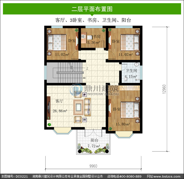 二 層: 客廳、3臥室、書房、衛生間、陽臺