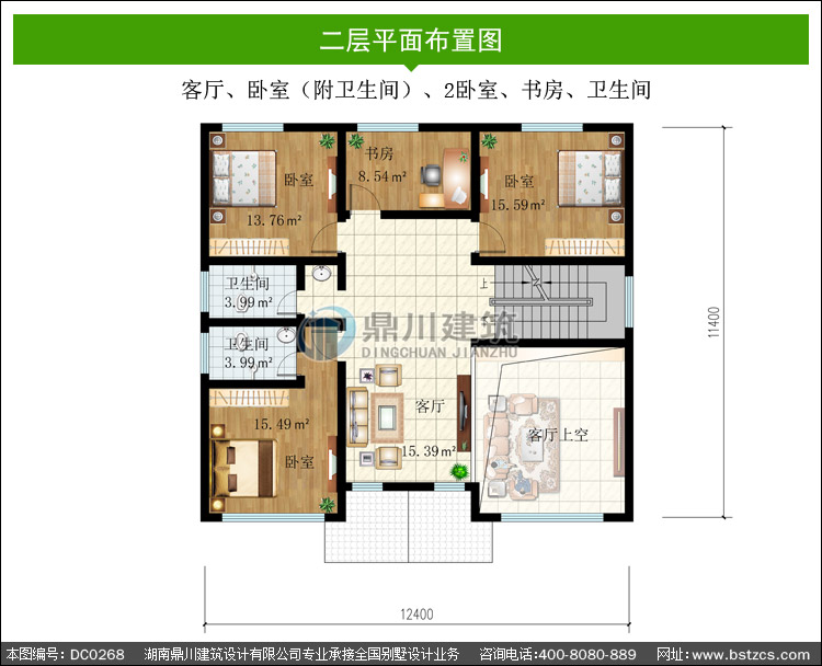 | 二 層: | 客廳、臥室(附衛(wèi)生間)、2臥室、書房、衛(wèi)生間 | |||