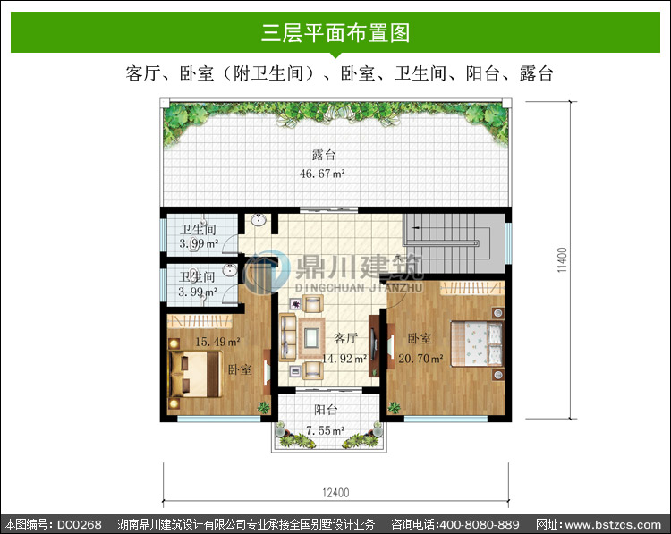 | 三 層: | 客廳、臥室(附衛(wèi)生間)、臥室、衛(wèi)生間、陽臺、露臺 | |||