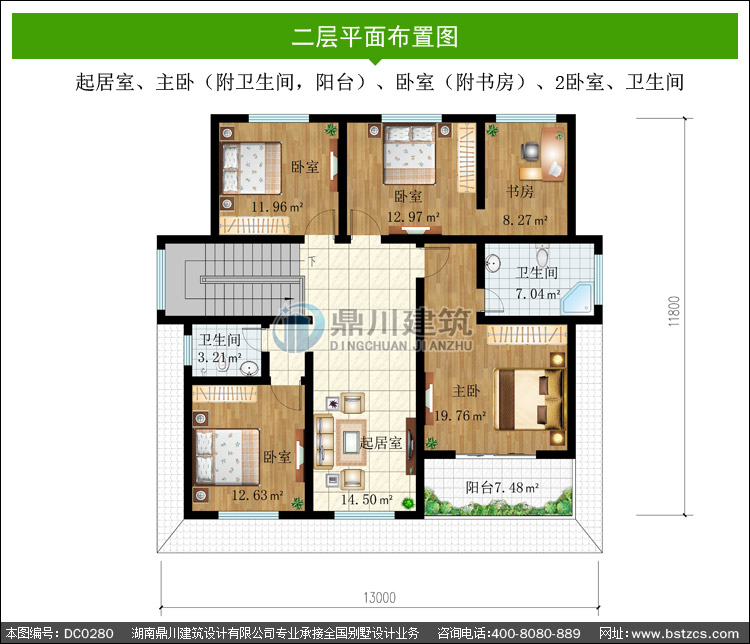 | 二 層: | 起居室、主臥(附衛(wèi)生間,陽臺)、臥室(附書房)、2臥室、衛(wèi)生間 | |||