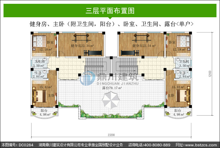 三 層: 健身房、主臥(附衛(wèi)生間,陽臺)、臥室、衛(wèi)生間、露臺