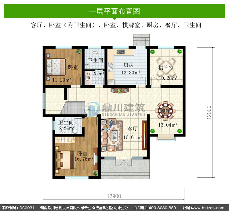 | 一 層: | 客廳、臥室(附衛(wèi)生間)、臥室、棋牌室、廚房、餐廳、衛(wèi)生間 | |||