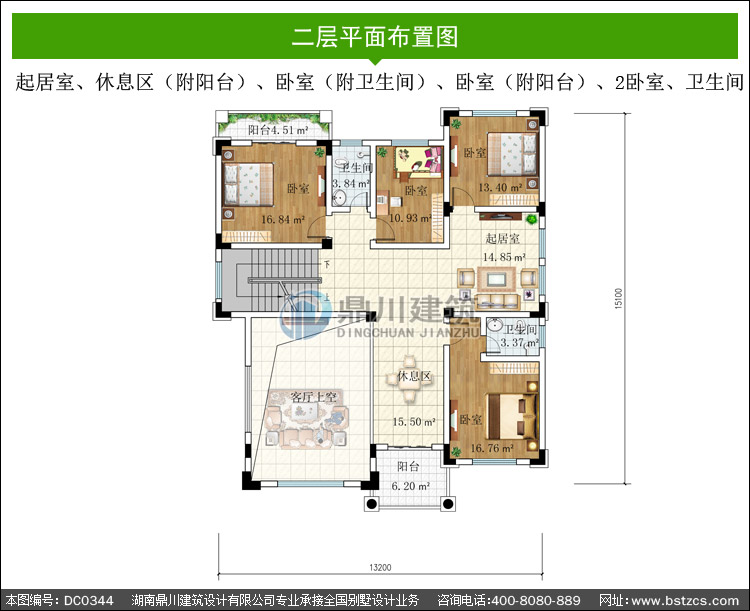 | 二 層: | 起居室、休息區(附陽臺)、臥室(附衛生間)、臥室(附陽臺)、2臥室、衛生間 | |||