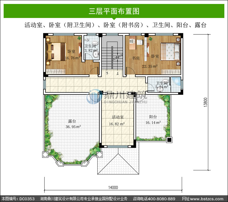 | 三 層: | 活動(dòng)室、臥室(附衛(wèi)生間)、臥室(附書房)、衛(wèi)生間、陽臺、露臺 | |||