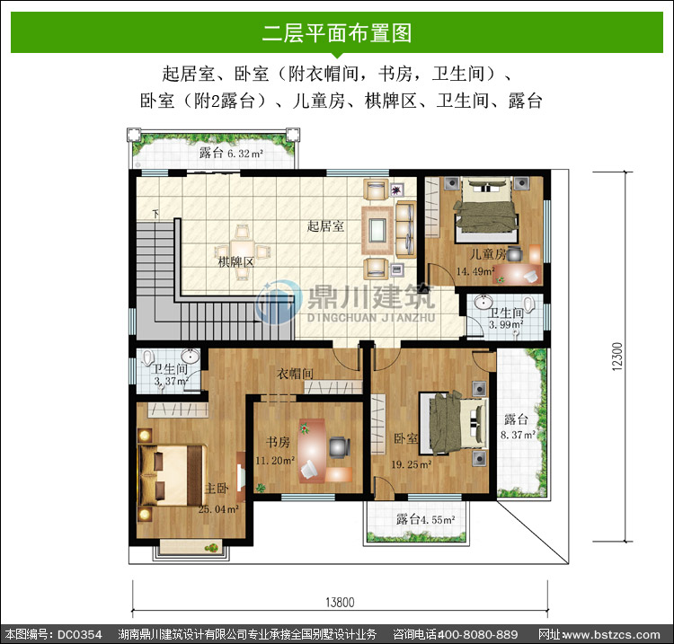 | 二 層: | 起居室(附陽臺)、臥室(附衣帽間,書房,衛生間)、臥室(附2露臺)、兒童房、棋牌區、衛生間、露臺 | |||