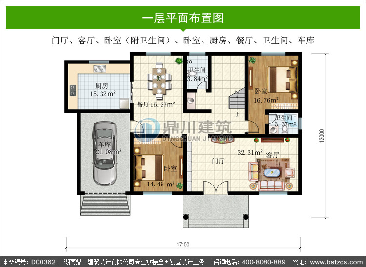 一 層: 門廳、客廳、臥室(附衛生間)、臥室、廚房、餐廳、衛生間、車庫