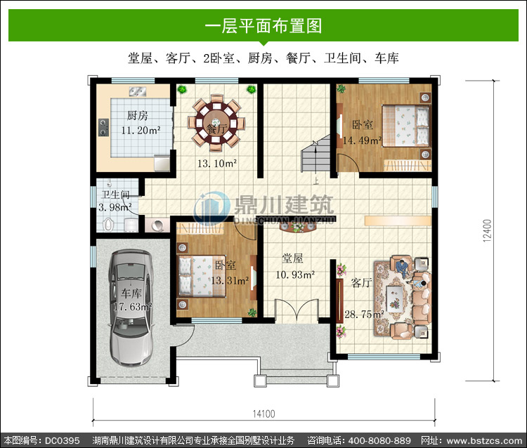 | 一 層: | 堂屋、客廳、2臥室、廚房、餐廳、衛(wèi)生間、車庫 | |||