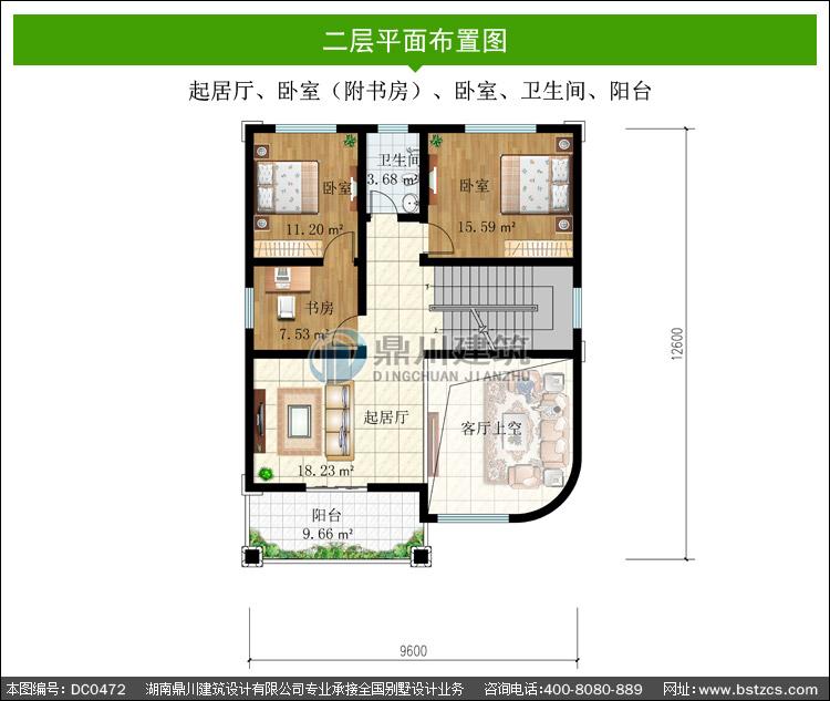 二 層: 起居廳、臥室(附書房)、臥室、衛生間、陽臺