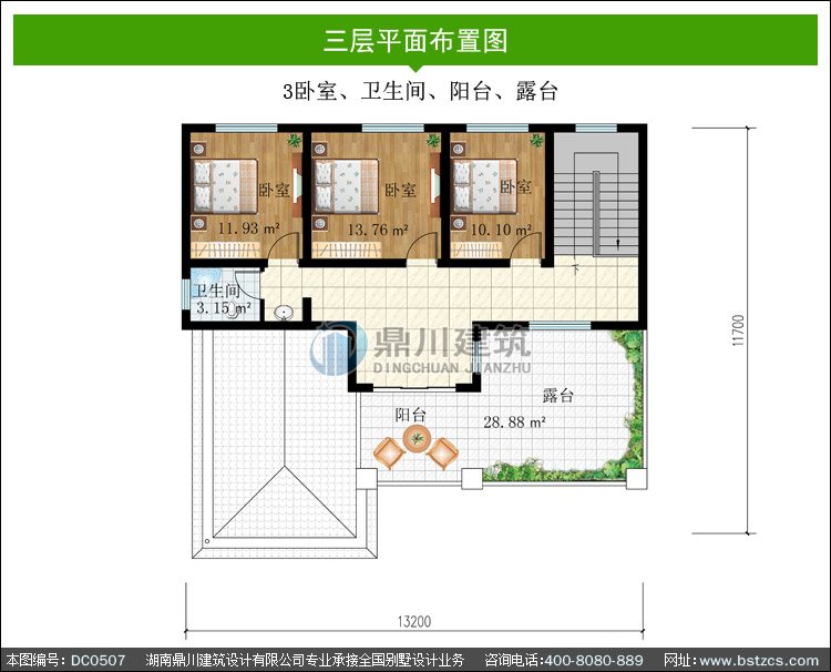 | 三 層: | 3臥室、衛生間、陽臺、露臺 | |||