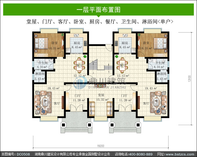 漂亮的二層共堂屋雙拼別墅設計圖紙_農村雙拼自建房設計圖,鼎川別墅設計