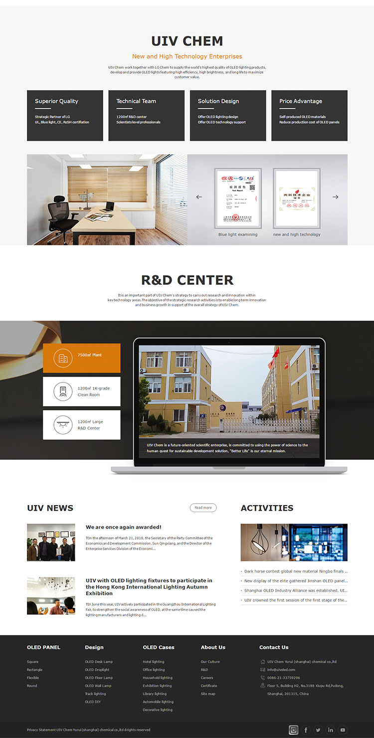 UIV Chem is a future -oriented scientific enterprise, is committed to using the power of science for human to seek sustainable development solutions, "make life better" is her eternal mission. Now, Our excellent products have been serving in many leading companies in the field of OLED display, OLED light, environmental protection, new energy,chemistry, medicine, biology,etc. and leading a lot of industry technological innovation.