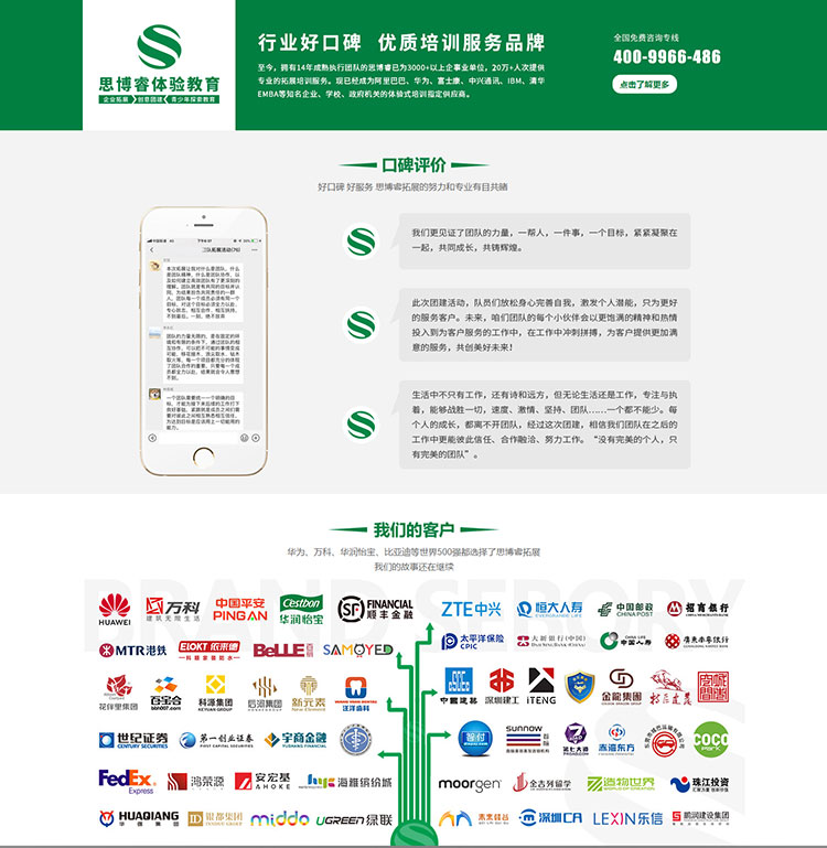 在客戶的忠實信賴與支持下,目前,思博睿已成長為課程體系新、服務模式優、滿意度高、行業口碑好的品牌培訓公司。思博睿培訓服務的足跡遍布全國,現已成為阿里巴巴、富士康、華潤怡寶、南粵銀行、IBM、清華EMBA、市委等知名企業、學校、政府機關的體驗式培訓指定供應商。